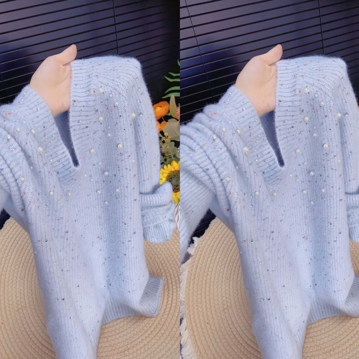 Artisan Embellishments: Adorned with hand-applied beads and rhinestones that create a captivating play of light and texture on a soft knit base.